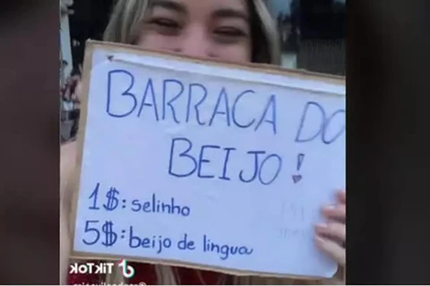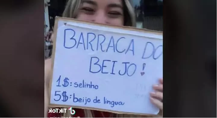 Ela colocou a plaquinha com os preços: R$ 1 para o beijo do tipo selinho e R$ 5 para o de língua. Com a brincadeira, ela faturou cerca de R$ 400, em PIX e em espécie.