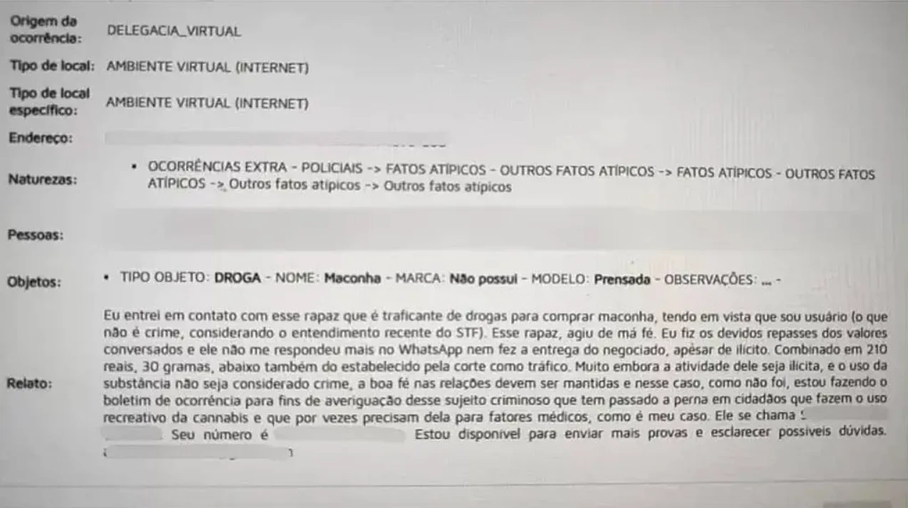 No BO, o homem afirma que fez um contato via WhatsApp com o vendedor e combinou a compra da droga por R$ 210. Após realizar o pagamento, o homem não teria respondido mais às mensagens e não fez a entrega.
