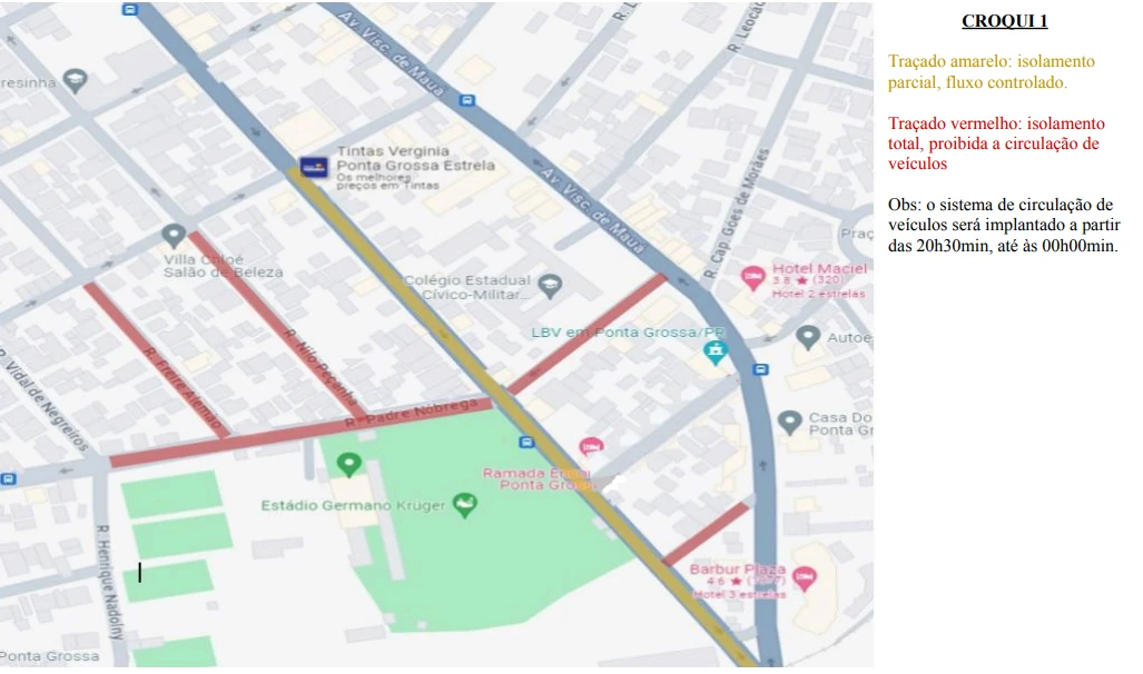 A Polícia Militar do Paraná informa que, em razão da realização da partida entre Operário Ferroviário Esporte Clube e Criciúma Esporte Clube, válida pelo Campeonato Brasileiro da Série B, na sexta-feira, dia 01 de agosto de 2025, serão implantadas interdições temporárias em vias públicas no entorno do Estádio Germano Krüger, em Ponta Grossa/PR, conforme croquis de congelamento de área anexos.