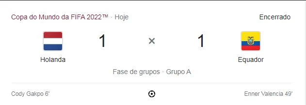 A Holanda e o Equador empataram por 1 a 1, no Estádio Internacional Khalifa, na cidade Ar-Rayyan, no Qatar, nesta tarde (25), e agora dividem a liderança da chave com quatro pontos.