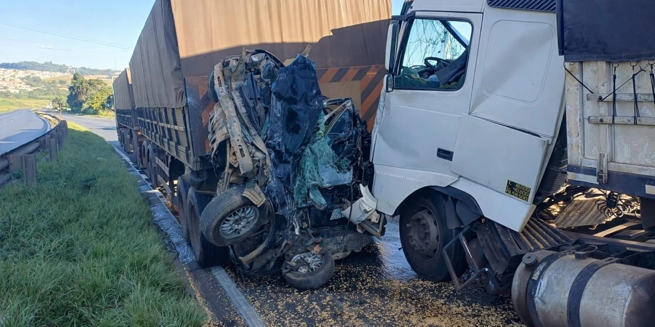 Veículo foi prensado no meio de dois caminhões; equipes do Siate, AeroMédico e PRF estão no local