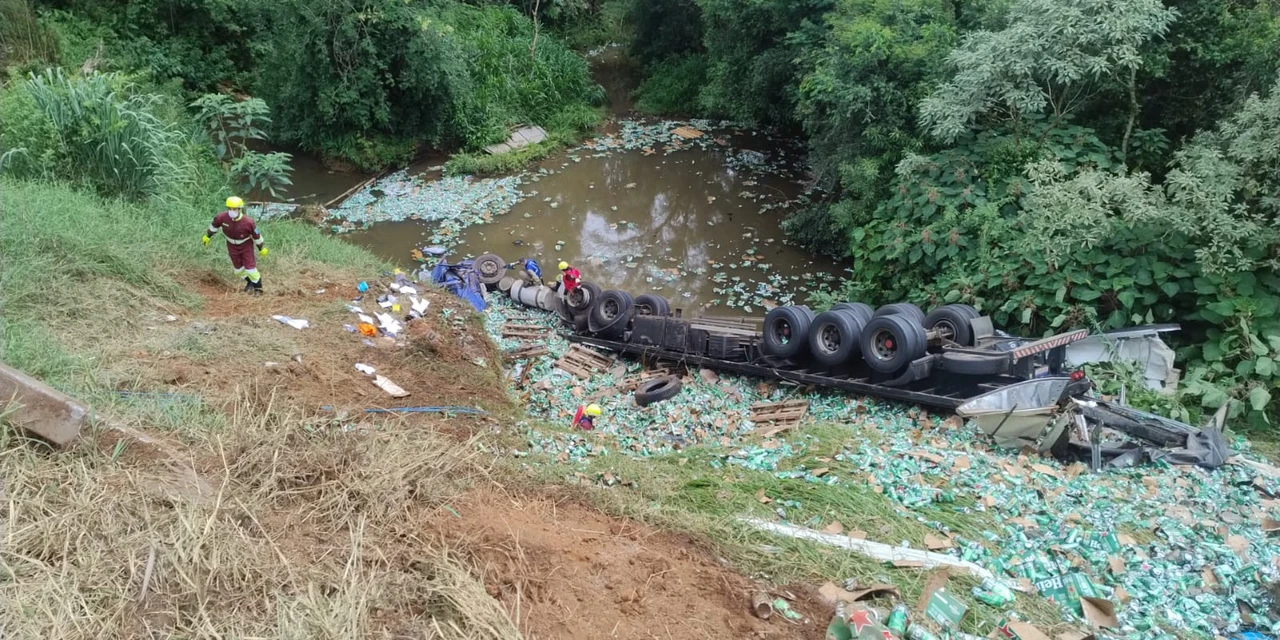 Motorista em óbito, preso nas ferragens submersas do caminhão. Carga destruída, parte dentro do rio.