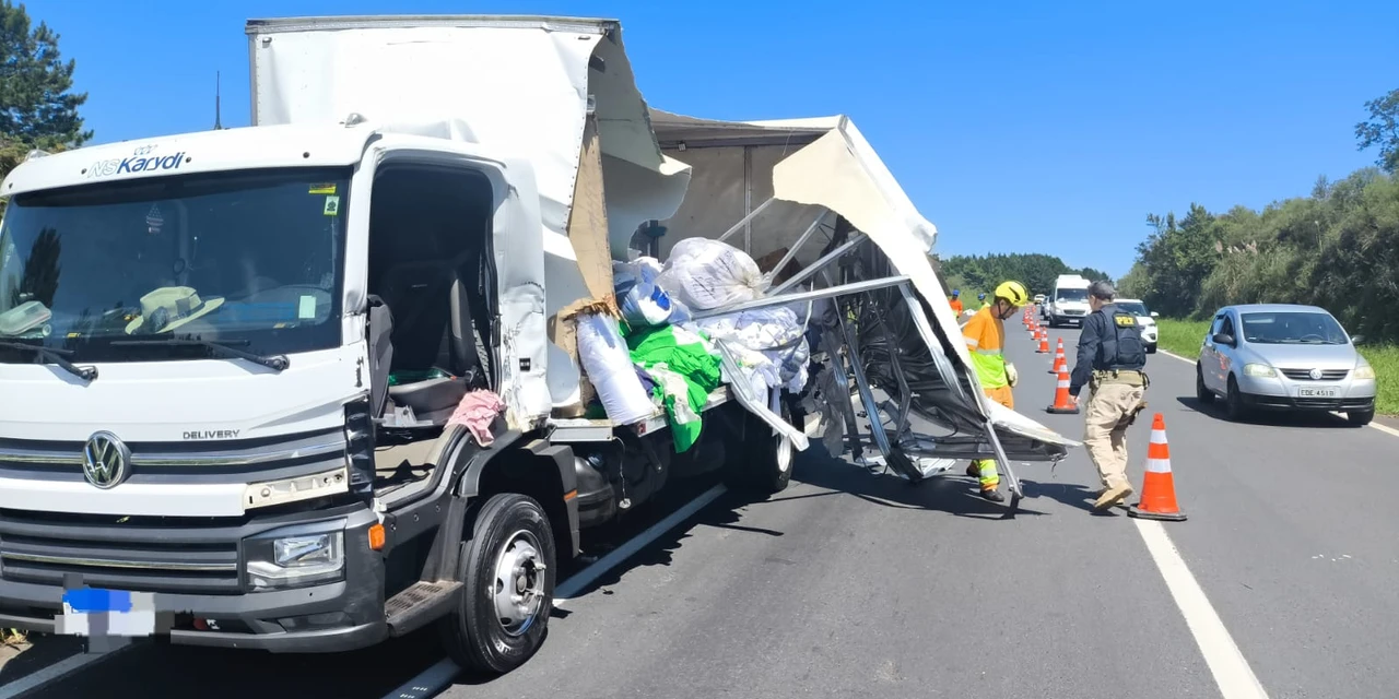 Um caminhão baú colidiu contra um caminhão de sinalização da CCR PR Vias, na manhã desta sexta-feira (9), na BR-376, em Ponta Grossa, no sentido Curitiba, na altura do km 530, proximidades da ponte do Rio Tibagi.