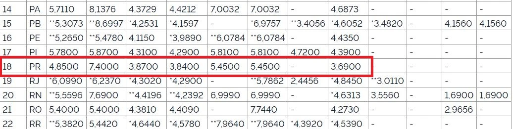 Segundo a tabela, o Acre tem a gasolina comum mais cara do Brasil, por R$ 6,23 em média o litro. No outro extremo está o Paraná, com R$ 4,85.