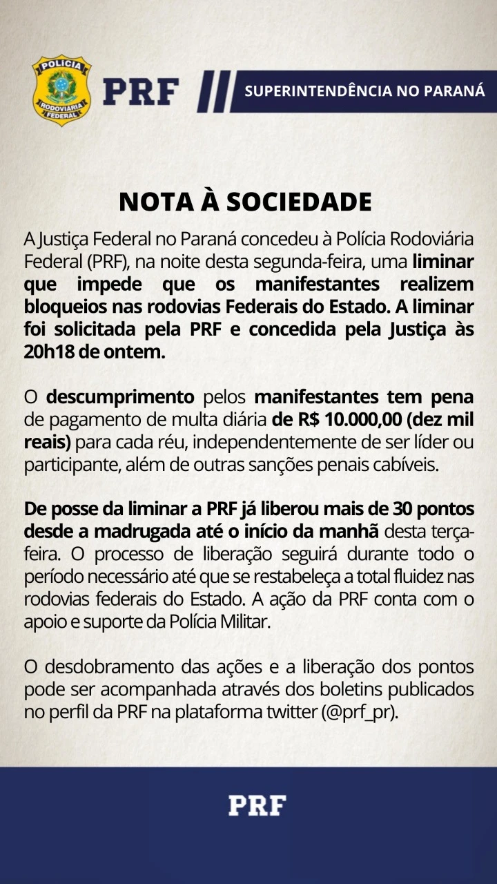 Após a decisão da Justiça Federal na noite desta segunda (31) que determina a liberação das rodovias federais do Paraná, a Policia Rodoviária Federal emitiu comunicado.