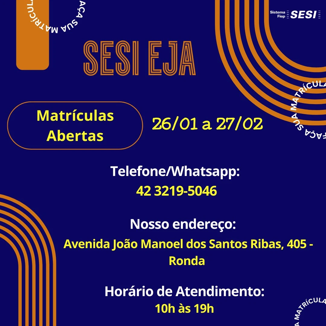 /Acelere os estudos mostrando o que você já aprendeu! A EJA (Educação de Jovens e Adultos) do Colégio Sesi Ponta Grossa é gratuita e destinada para maiores de idade. As aulas presenciais iniciam dia 02 de março 2026.
