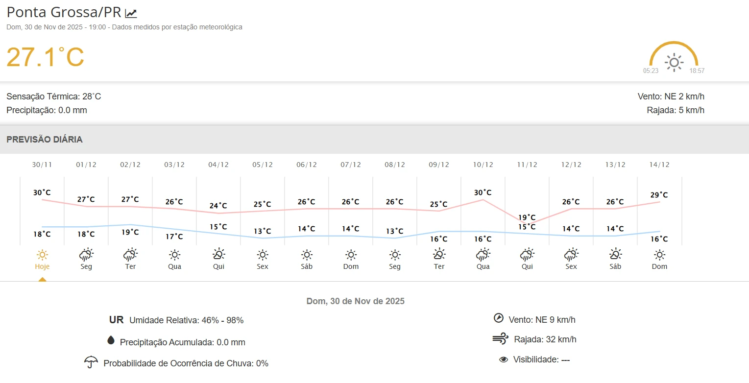 O Sistema de Tecnologia e Monitoramento Ambiental do Paraná (Simepar) destaca que os temporais devem ser localizados e acompanhados de altas temperaturas. No noroeste, por exemplo, os termômetros podem chegar a 38°C neste domingo (30).