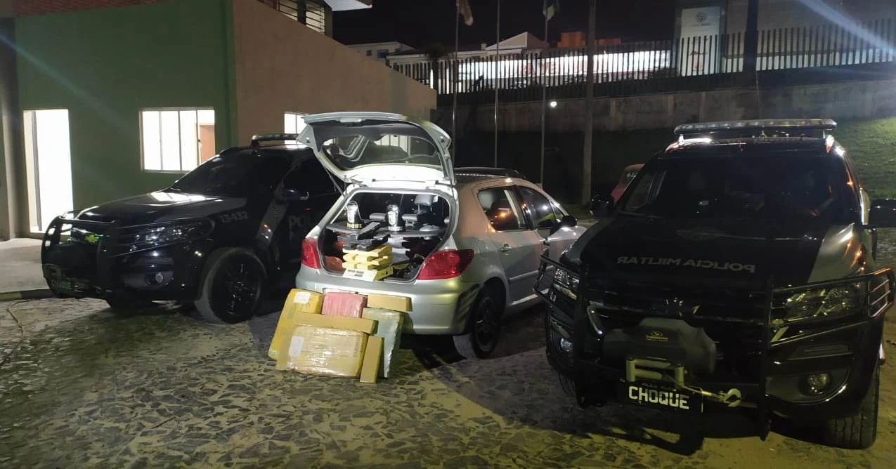 Diante da suspeição os policiais realizaram a abordagem e localizaram no interior do automóvel, no banco do passageiro, 20 quilos de substância análoga à maconha.