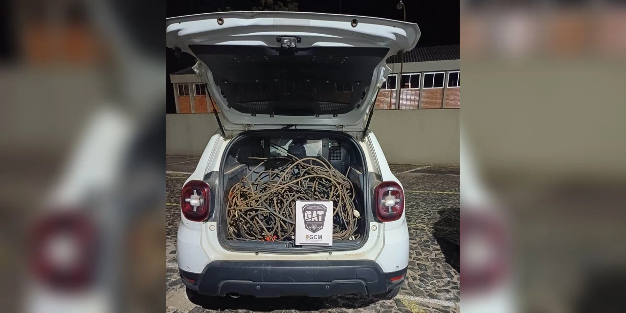 Diante do relato, foi identificado o suspeito, que estava com aproximadamente 400 metros de fio de energia de vários diâmetros, totalizando aproximadamente 40 quilos.