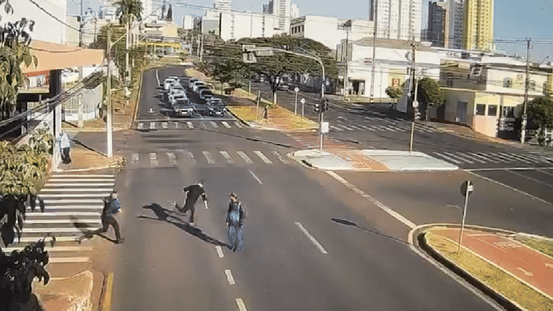 Em imagens registradas por câmeras do local, é possível ver que os seguranças correm atrás do homem e conseguem alcançá-lo no meio de uma avenida.
