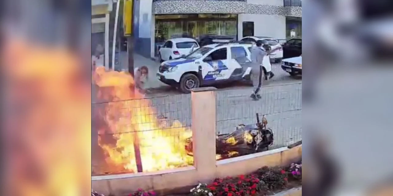 Imagens de câmeras de segurança flagraram o momento em que os policiais ordenam que ele largue o recipiente. Ignorando as ordens, o suspeito despejou o combustível sobre a moto e também sobre a mãe, que tentava segurá-lo para impedir a destruição do veículo, iniciando o incêndio na sequência.