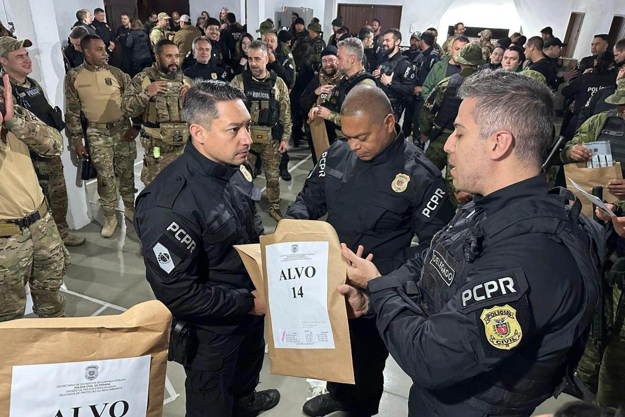 Com apoio aéreo de um helicóptero da PCPR, os policiais civis cumprem 38 mandados de busca e apreensão em residências, clínicas veterinárias e cativeiros. A operação mira a estrutura criminosa identificada e seus principais distribuidores em âmbito nacional e regional.