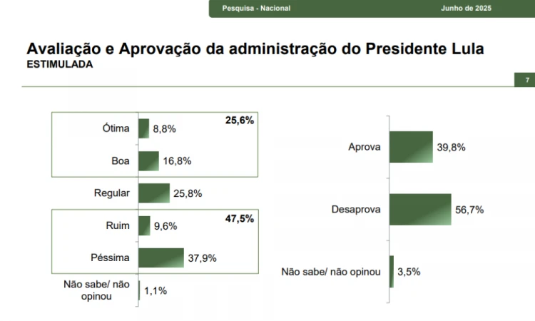 Um pequeno percentual, 3,5%, não soube ou preferiu não responder. Quando o foco se volta para o terceiro mandato do presidente Lula, as opiniões se dividem: 8,8% consideram a gestão ótima, 16,8% a classificam como boa, e 25,8% a avaliam como regular.