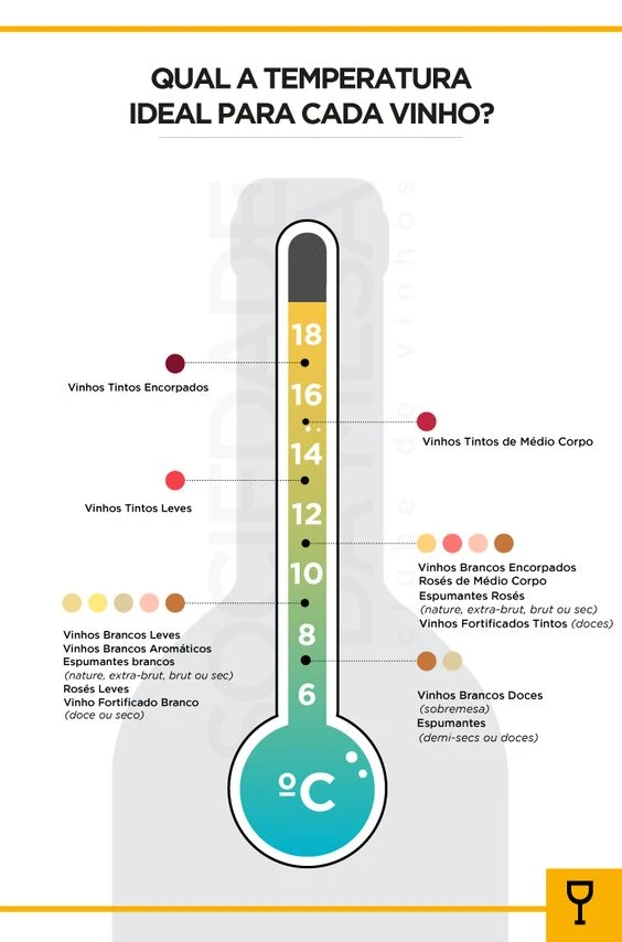 vinho de mesa com sabor morto, veja o infográfico abaixo e conheça a temperatura ideal para cada tipo de vinho.